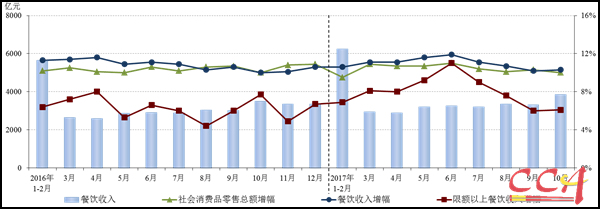 11月14日國家統(tǒng)計局最新發(fā)布數(shù)據(jù),2017年10月,全國餐飲收入3852億元,同比增長10.3%;限額以上單位餐飲收入906億元,同比增長6.1%。2017年1-10月,全國餐飲收入32279億元,同比增長10.9%;限額以上單位餐飲收入7932億元,同比增長7.8%。
